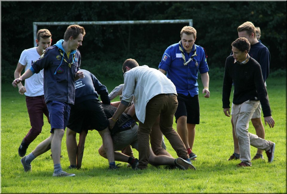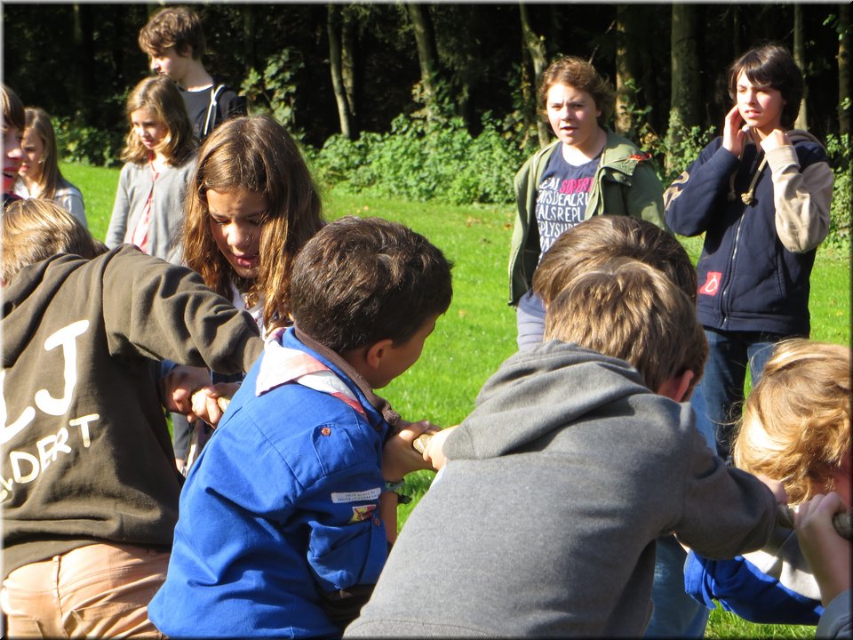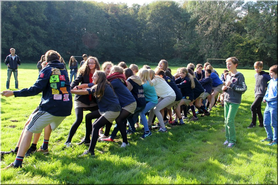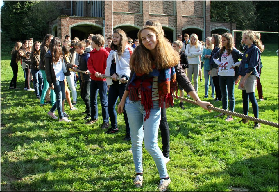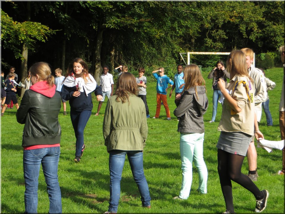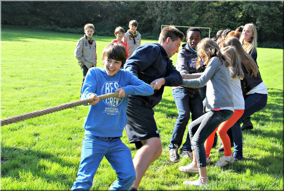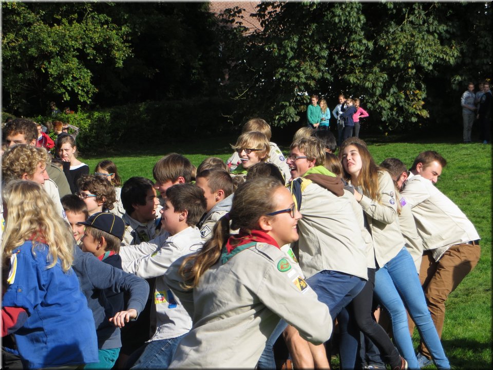 Bij het touwtrekken trokken de scouts, met het lichte voordeel in aantal leden, telkens aan het langste eind. Daarna volgde er een leuk en wild halfuurtje kringspelen en het spel Dikke Berta aan het einde. Heel wat leraars kwamen ook afgezakt naar het terrein, maar de aanblik van zoveel modder deed de meesten, om begrijpelijke redenen, wat afstand houden.