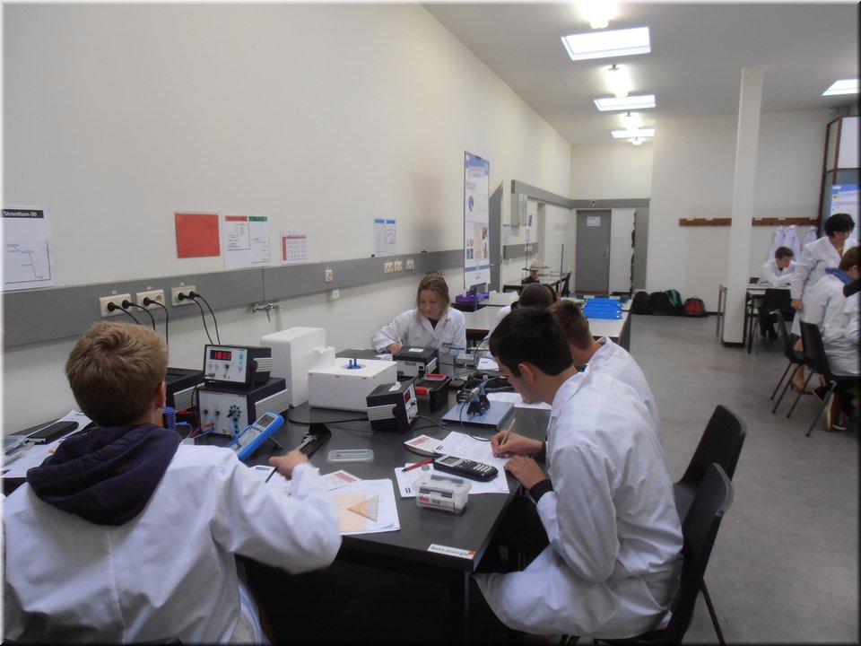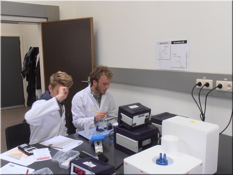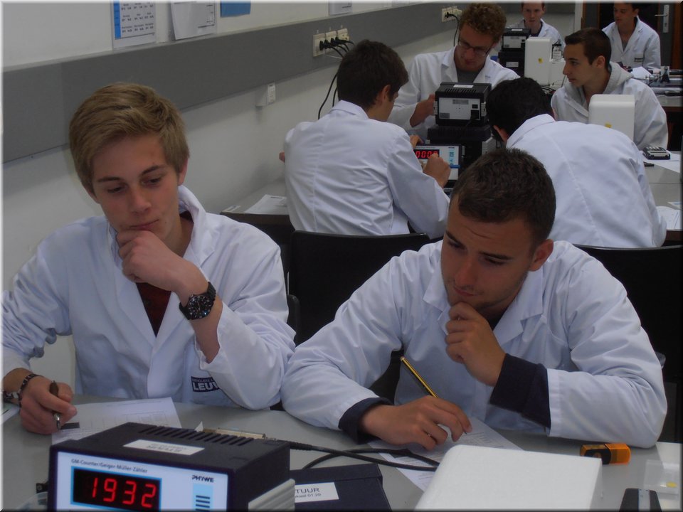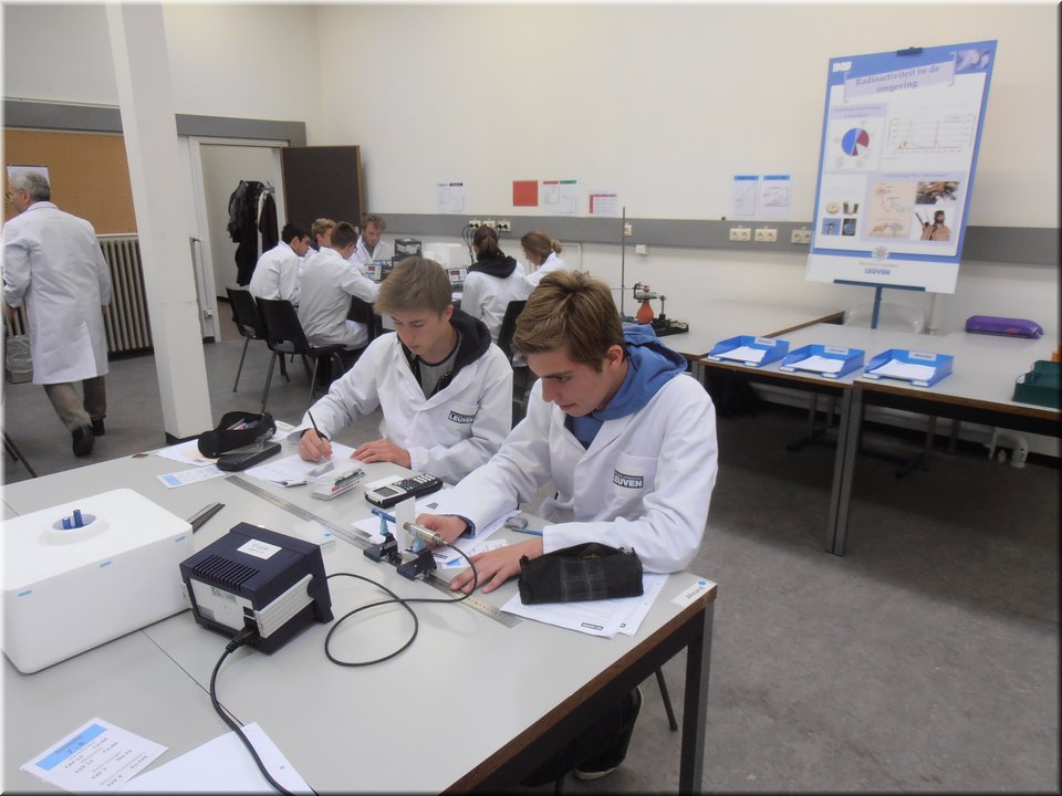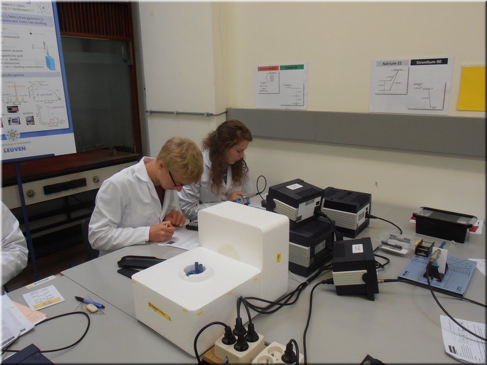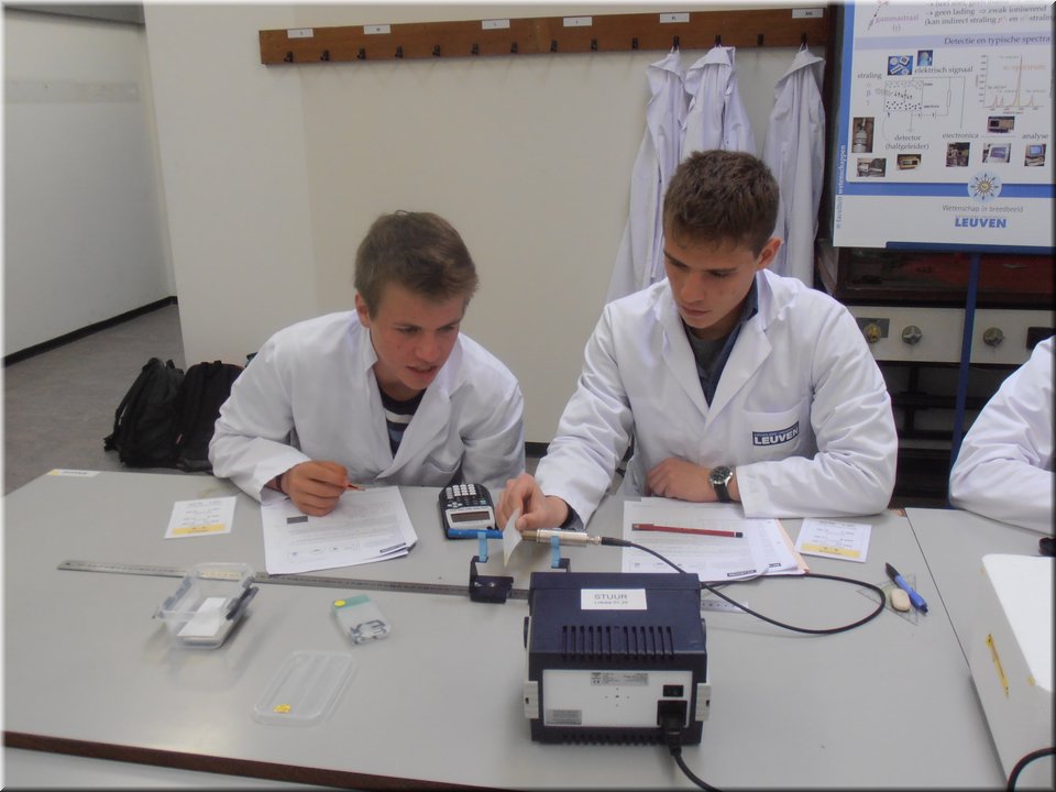 Eind mei trokken de leerlingen van het 5e jaar naar Heverlee. Hier mochten ze de leerstof kernfysica afronden door het zelfstandig uitvoeren van een reeks practica. Het waren uiteenlopende experimenten waarin ze radioactieve bronnen leerden detecteren, waarin ze het verband tussen stralingsintensiteit en afstand nagingen en waarin ze radioactieve straling zichtbaar maakten. Kortom, de theorie kon op een veilige, begeleide wijze in de praktijk worden omgezet!