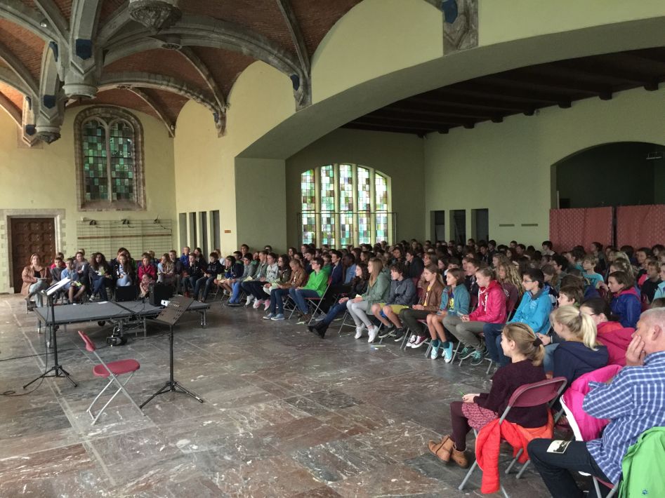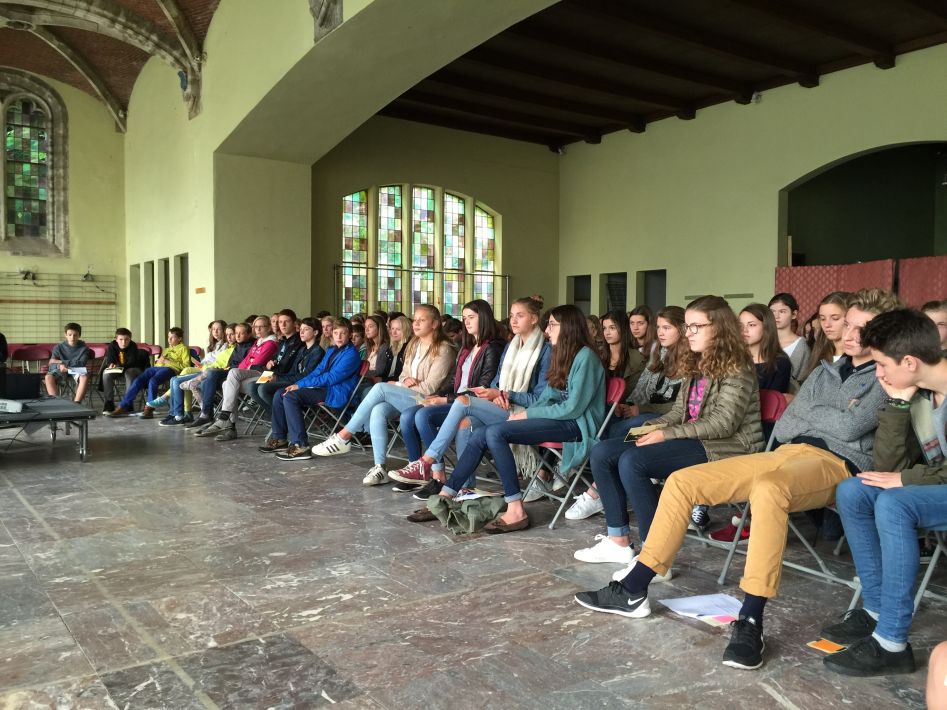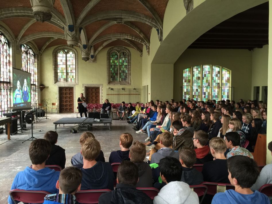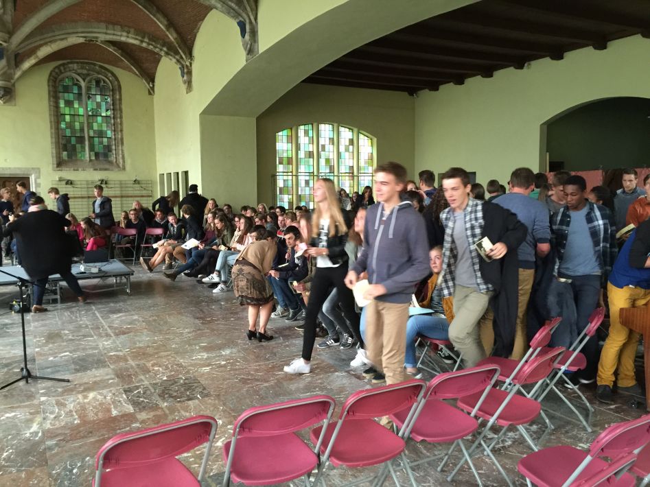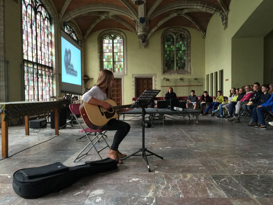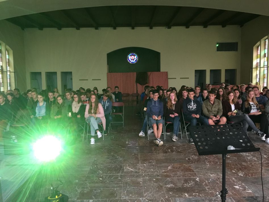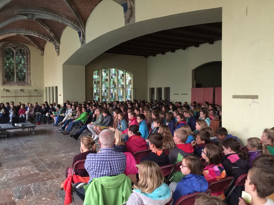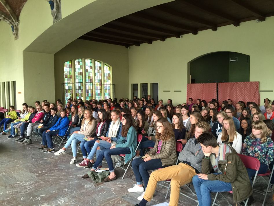 Op donderdag 17 september hielden we met alle graden een startviering in de orangerie. De godsdienstleraars en vele leerlingen hadden tijd en energie in de voorbereiding gestoken. Het boeiende resultaat was dan ook merkbaar. Met een wervelend uur vol multimedia en interactie en met woord en muziek door leraars en leerlingen werd je zo meegezogen. Tijd om te beleven en mee te maken, maar ook tijd om na te denken over jezelf en school en de wereld rond je.
