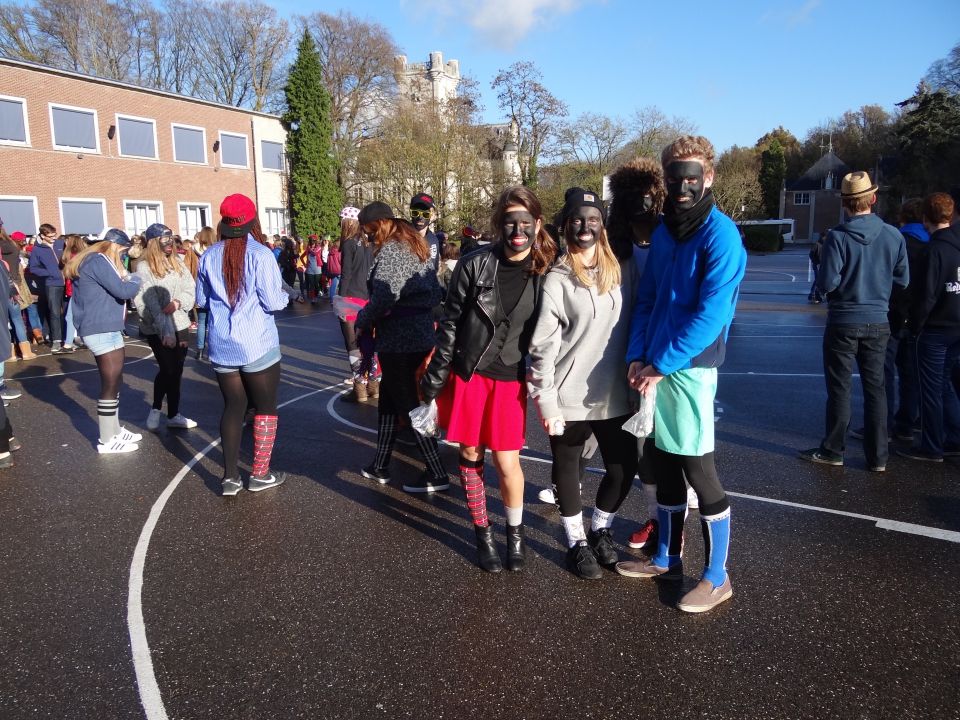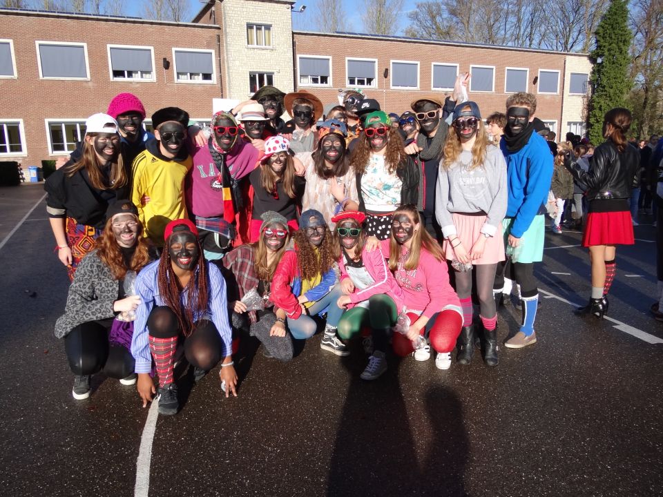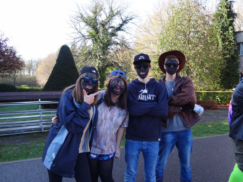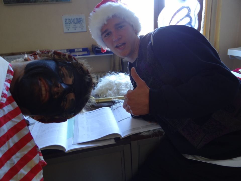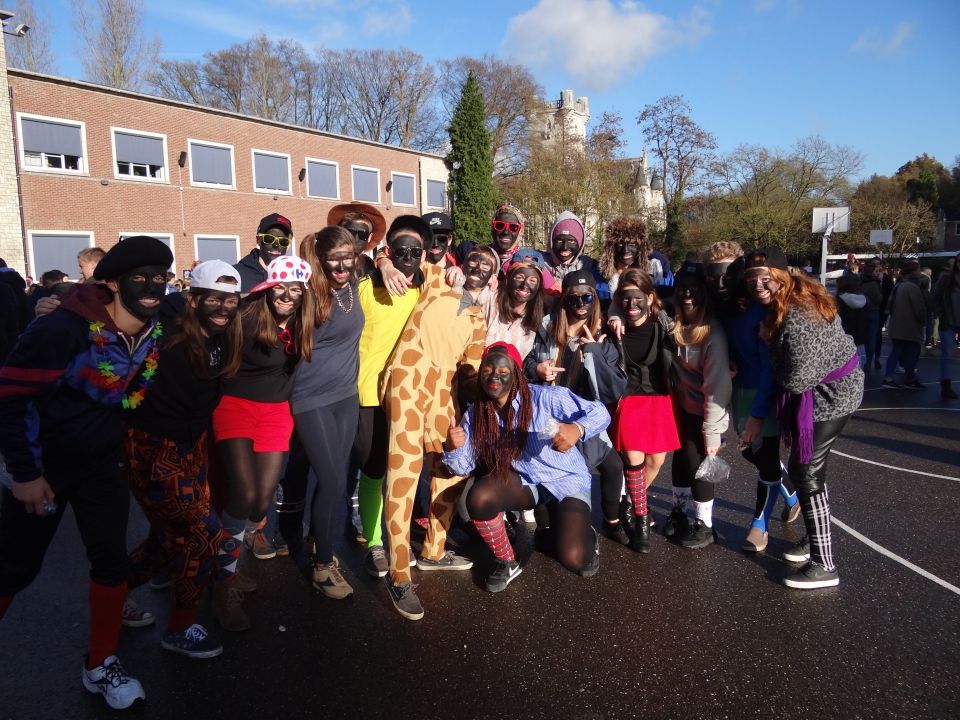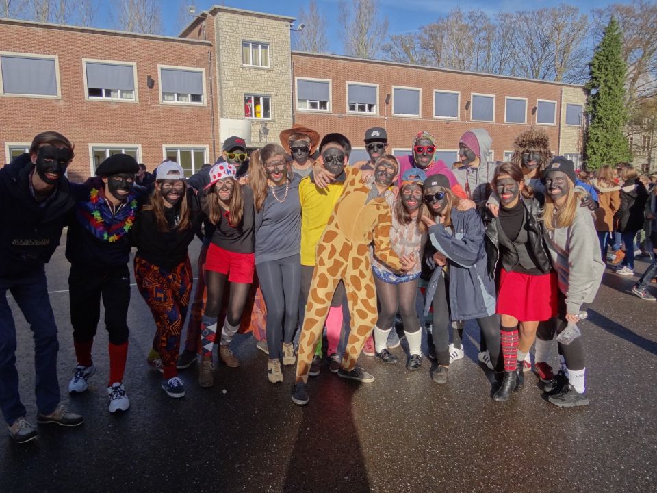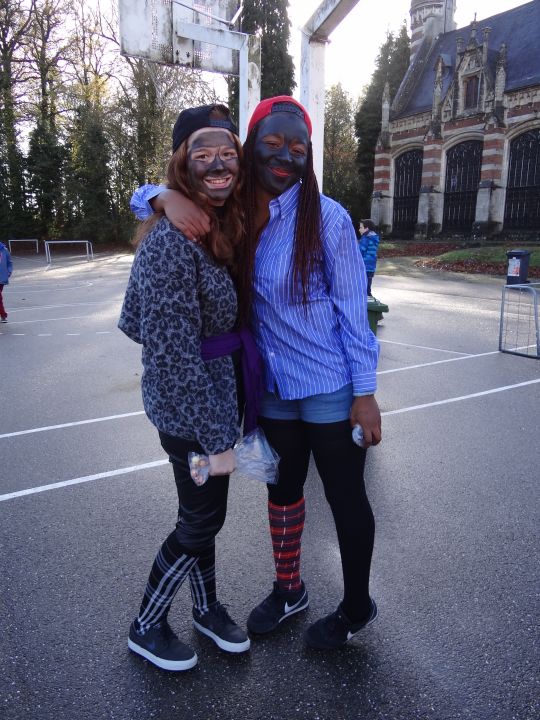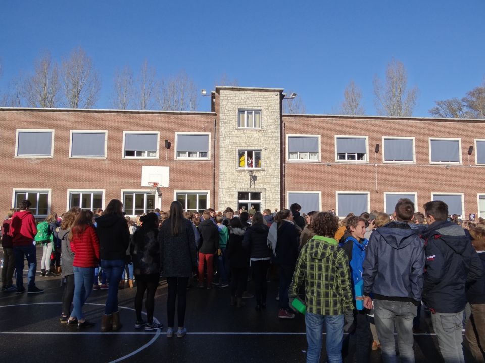 Afgelopen donderdag was het weer zover: de Sint deed zijn intrede in het Sint-Janscollege. Deze Sinterklaaseditie ging zeker niet onopgemerkt voorbij. Een grote groep Zwarte Pieten loodste de leerlingen uit de refter naar de speelplaats om met hen de Sint te verwelkomen, maar die was op het eerste gezicht nergens te bespeuren. Op weg naar de speelplaats werden de leerlingen dan opeens verrast door een zwarte Sint (!), die, in een racewagen, zijn publiek toegesneld kwam. Nadat de Sint zijn intrede gedaan had, verwelkomde hij zijn leerlingen en sprak hen met een originele speech toe. (zie onderstaande tekst) De Pieten bezorgden intussen de zingende jongeren extra snoep en koekjes.