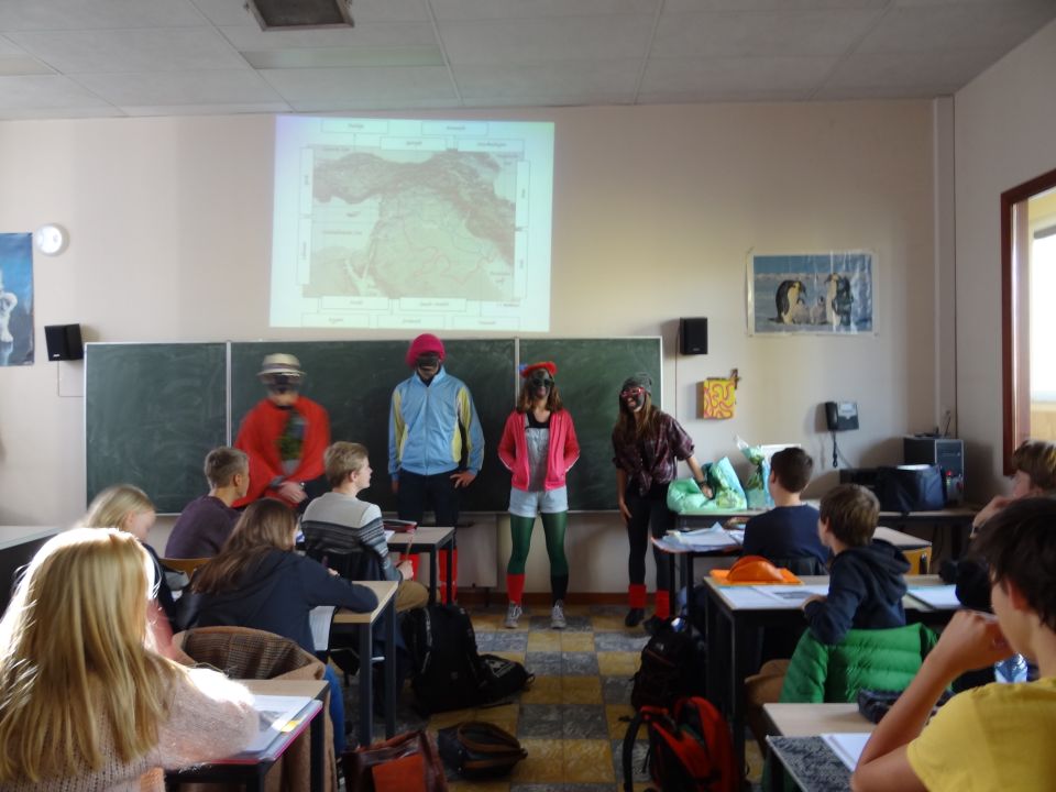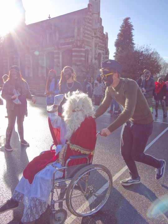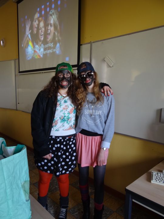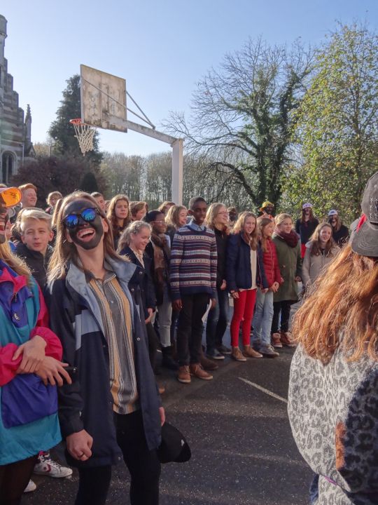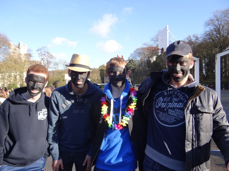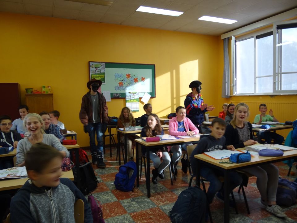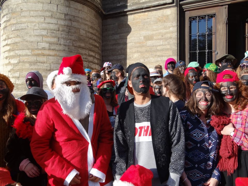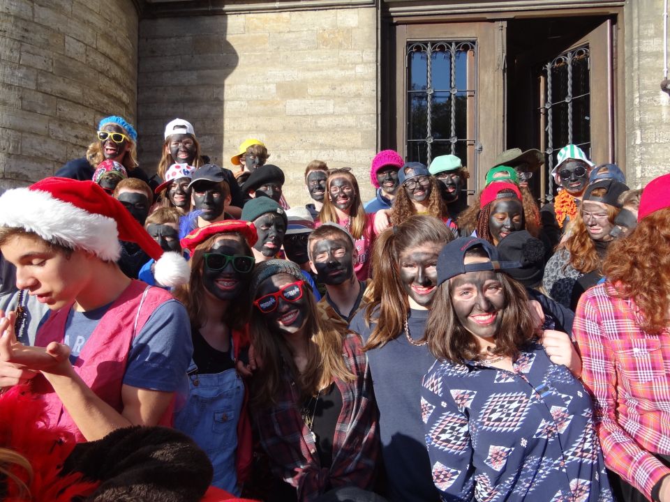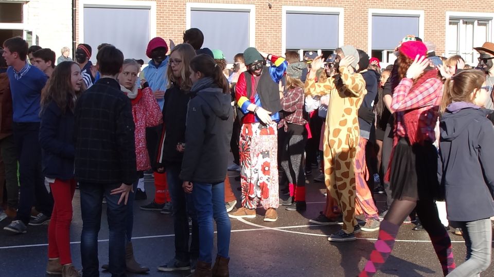 Afgelopen donderdag was het weer zover: de Sint deed zijn intrede in het Sint-Janscollege. Deze Sinterklaaseditie ging zeker niet onopgemerkt voorbij. Een grote groep Zwarte Pieten loodste de leerlingen uit de refter naar de speelplaats om met hen de Sint te verwelkomen, maar die was op het eerste gezicht nergens te bespeuren. Op weg naar de speelplaats werden de leerlingen dan opeens verrast door een zwarte Sint (!), die, in een racewagen, zijn publiek toegesneld kwam. Nadat de Sint zijn intrede gedaan had, verwelkomde hij zijn leerlingen en sprak hen met een originele speech toe. (zie onderstaande tekst) De Pieten bezorgden intussen de zingende jongeren extra snoep en koekjes.