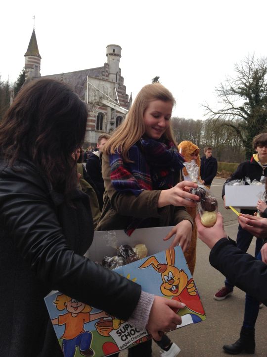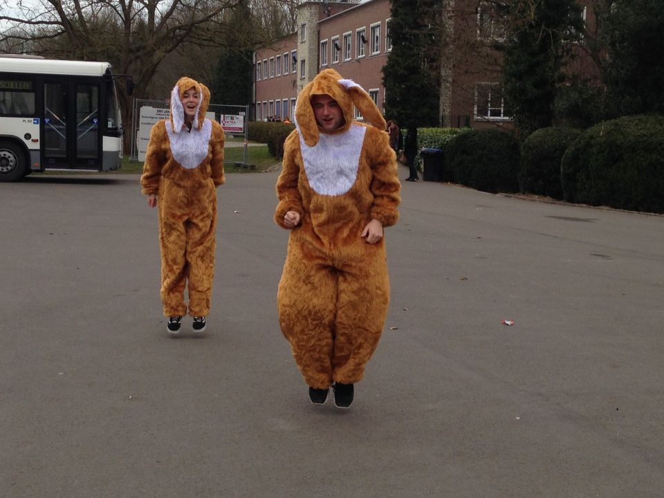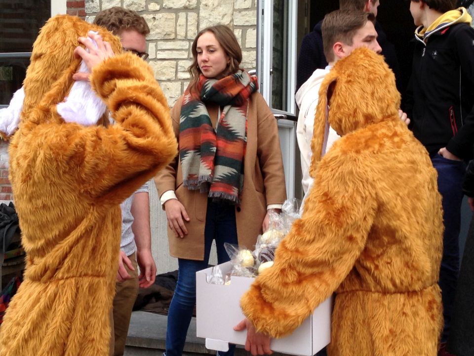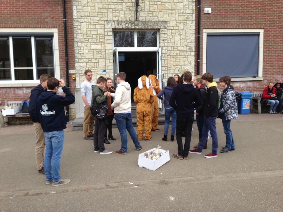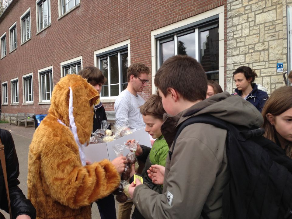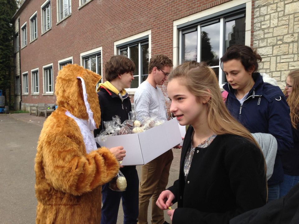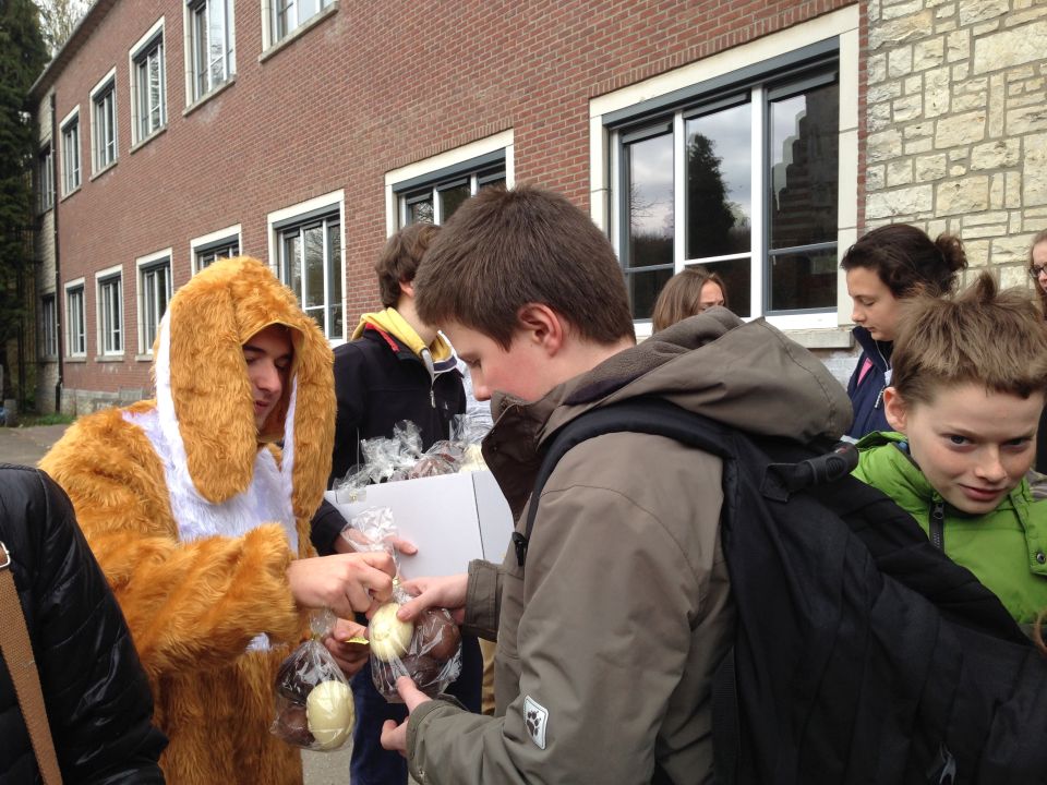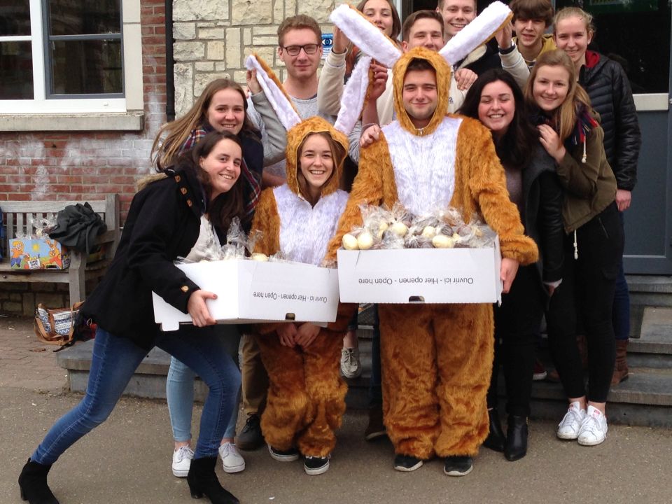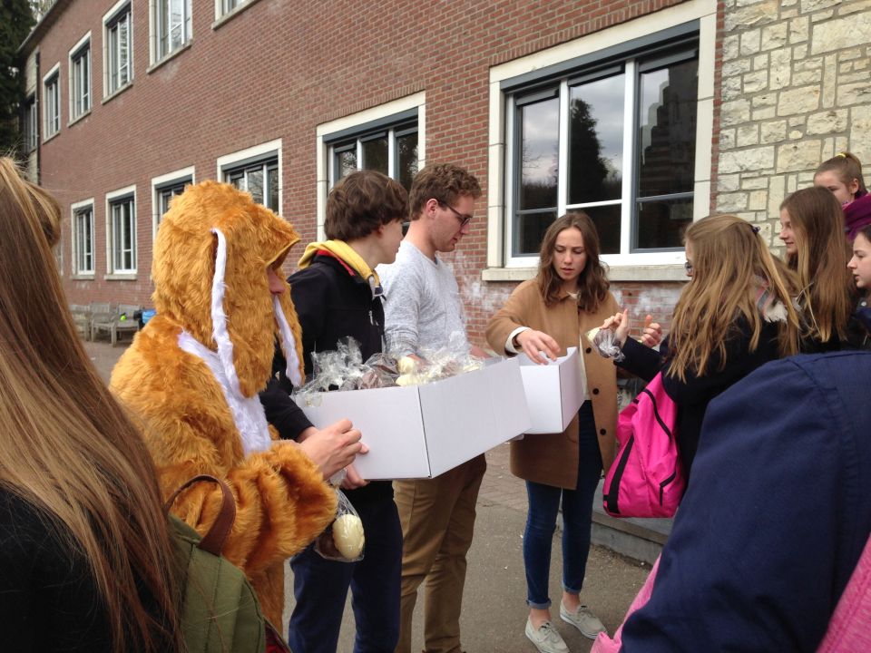 Het is al enkele jaren een fijne traditie. Aan het einde van de examenreeks, trakteert onze leerlingenraad alle leerlingen op heerlijke paaseitjes. Daarvoor werden ook dit jaar twee heuse Paashazen (Lotte en Victor!) opgetrommeld, geassisteerd door een hele bende laatstejaars.