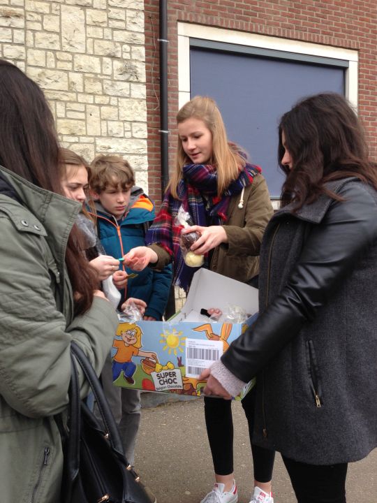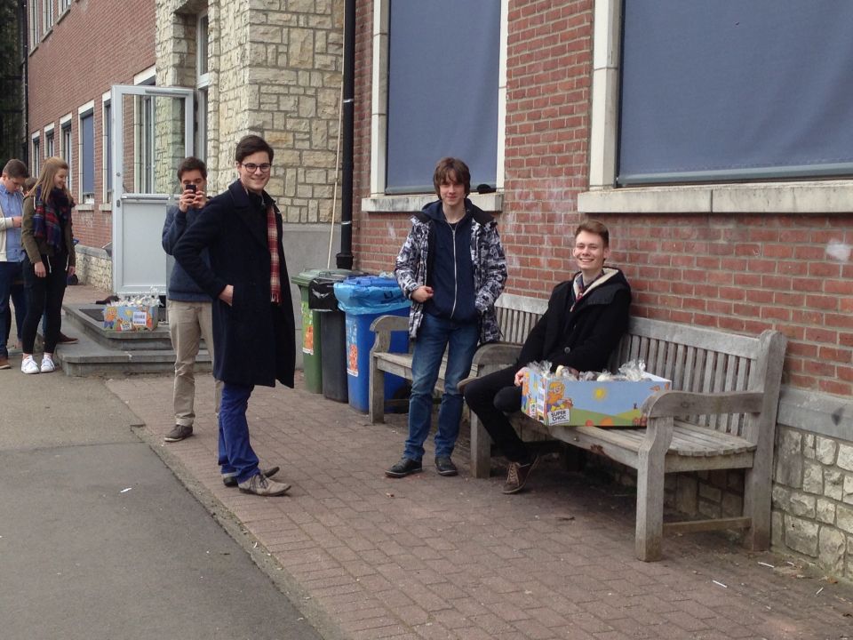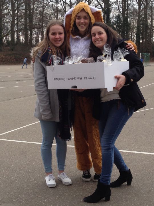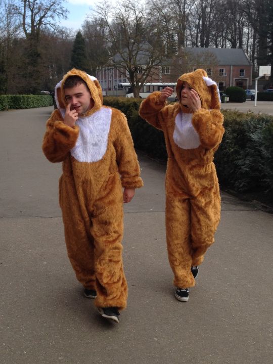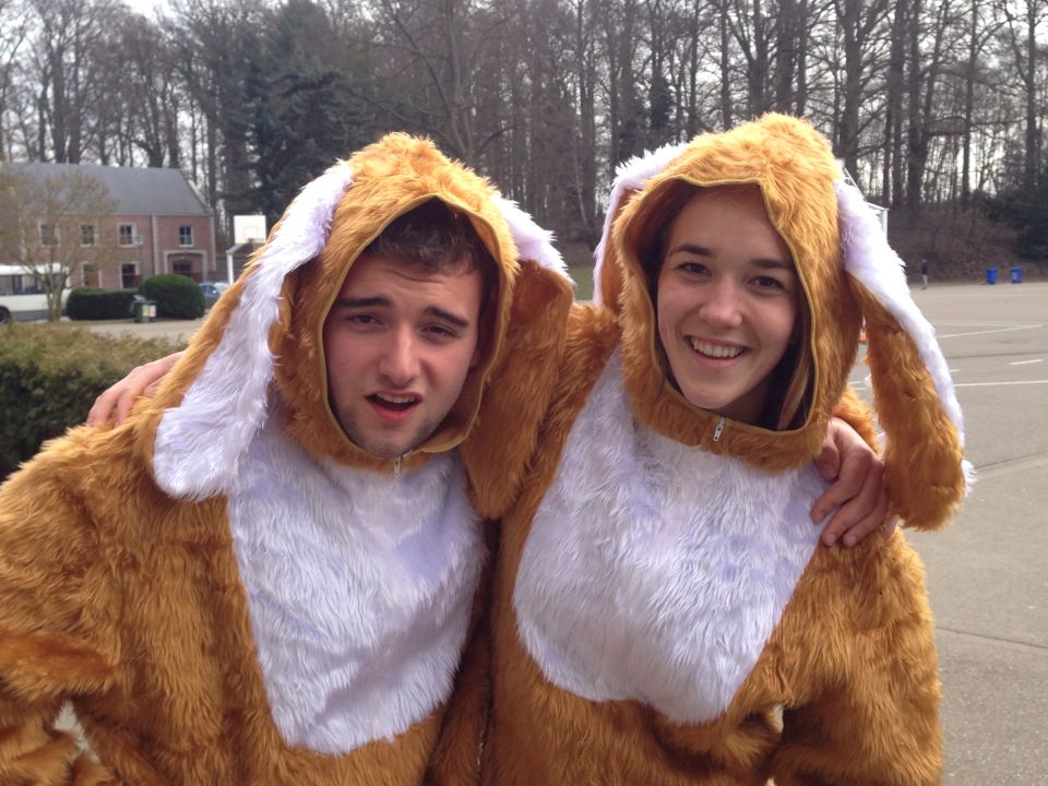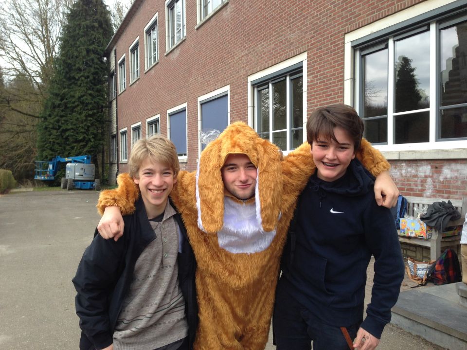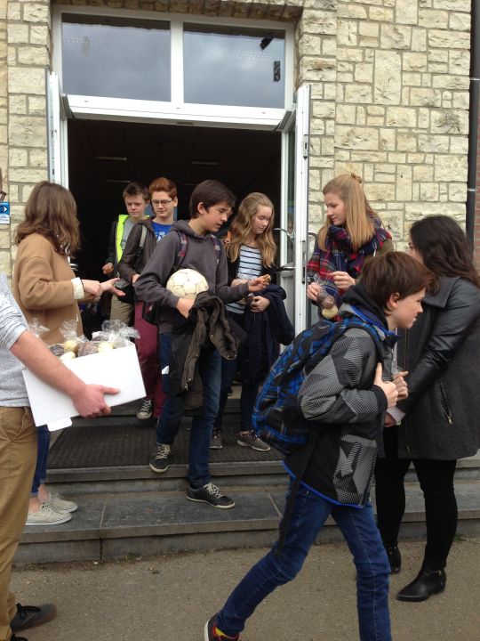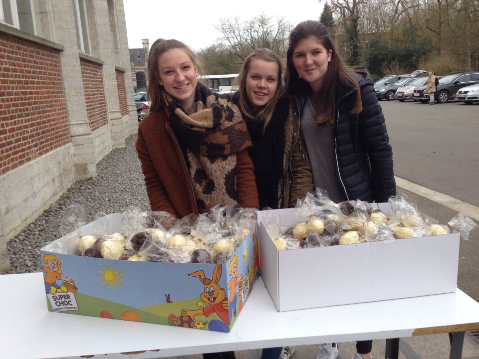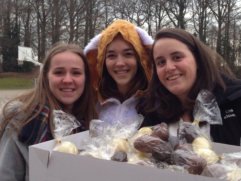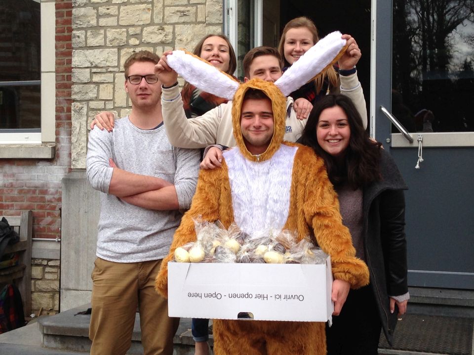 Het is al enkele jaren een fijne traditie. Aan het einde van de examenreeks, trakteert onze leerlingenraad alle leerlingen op heerlijke paaseitjes. Daarvoor werden ook dit jaar twee heuse Paashazen (Lotte en Victor!) opgetrommeld, geassisteerd door een hele bende laatstejaars.
