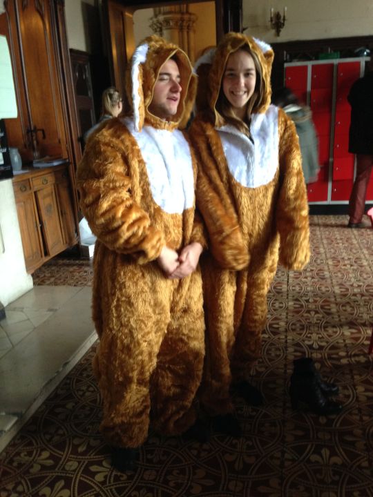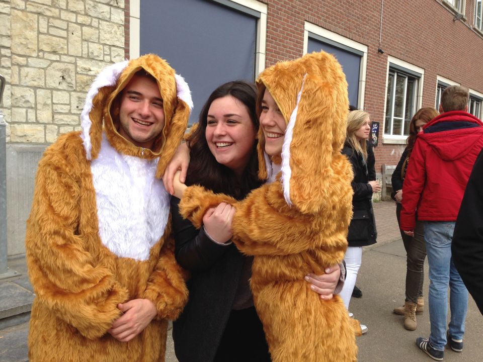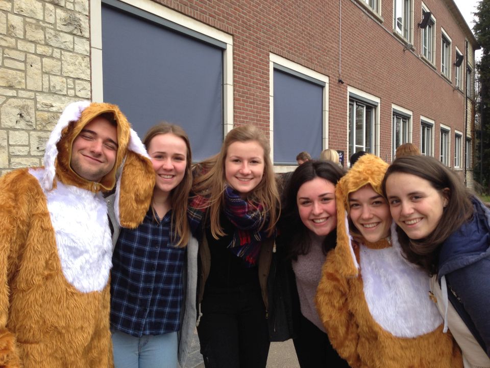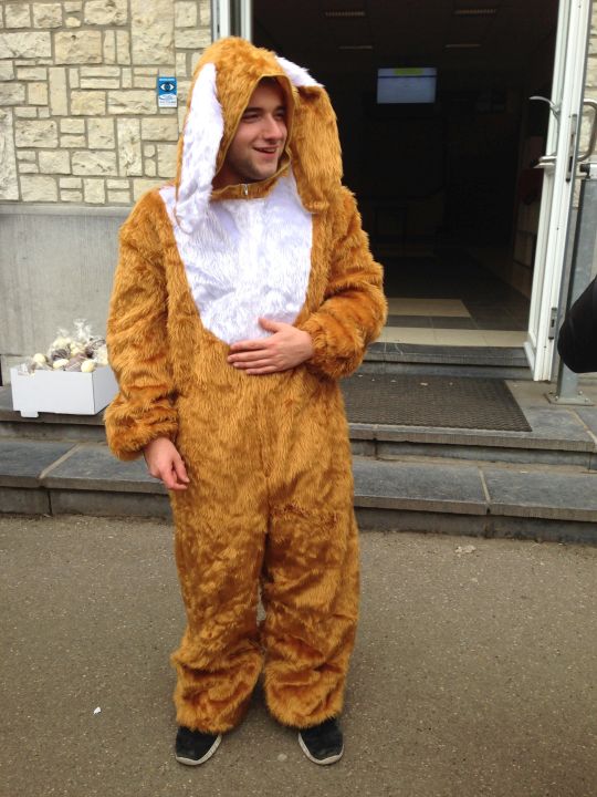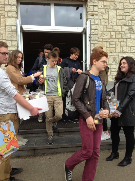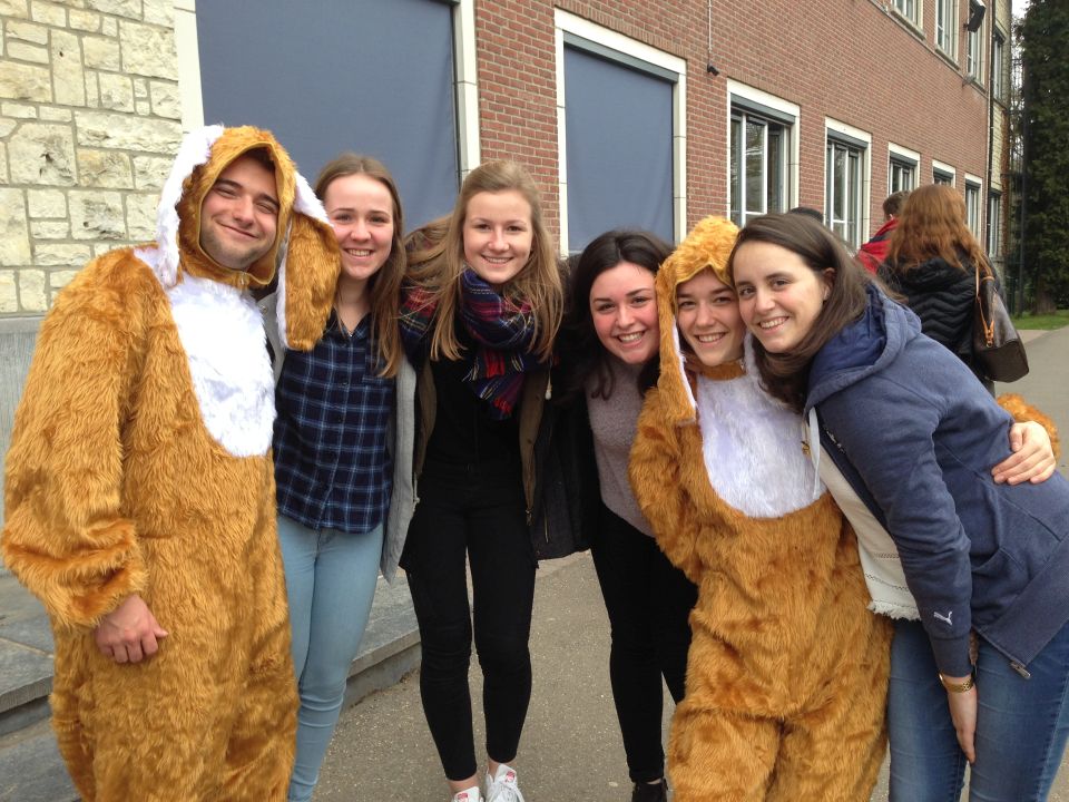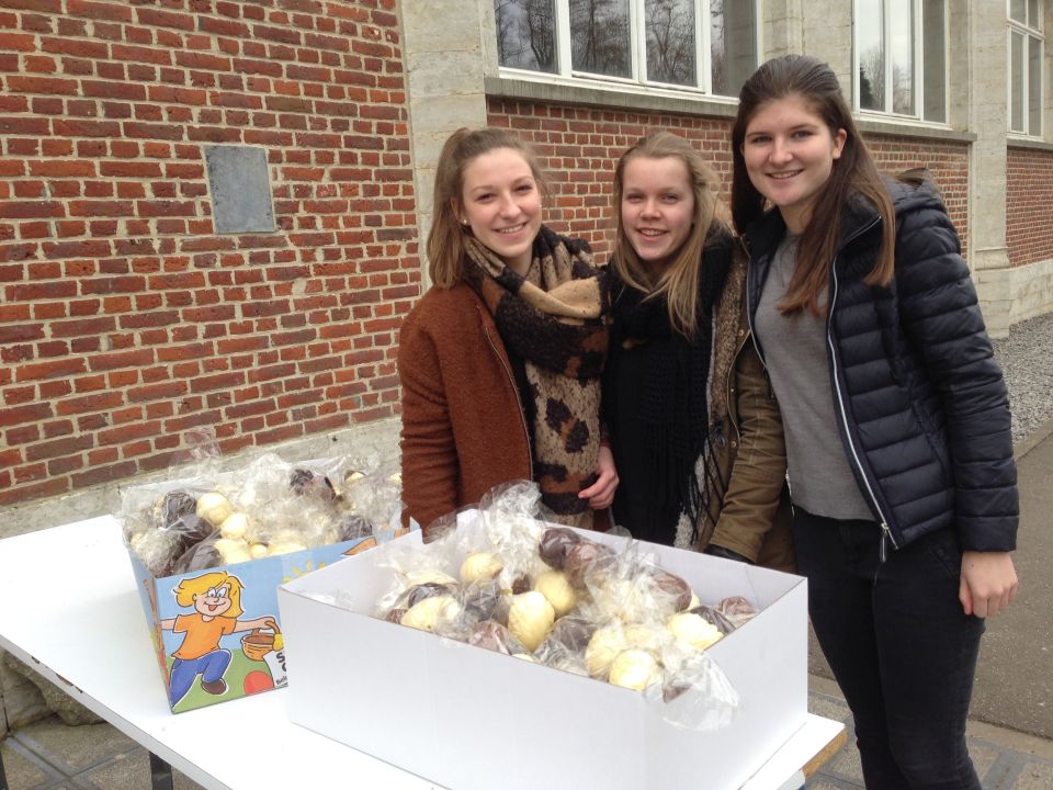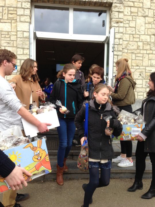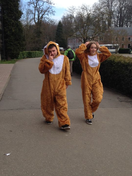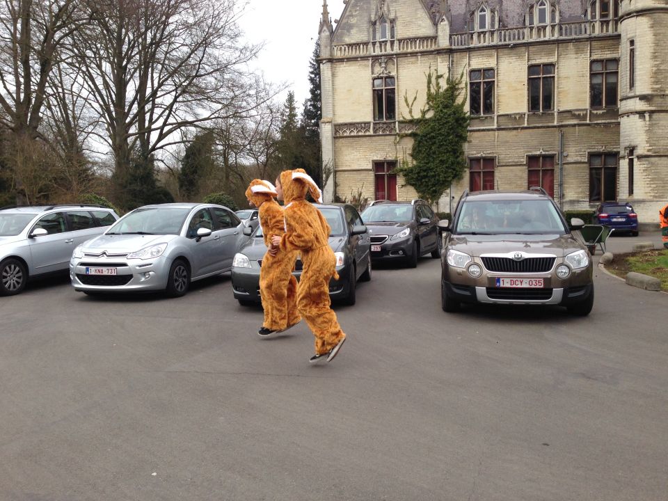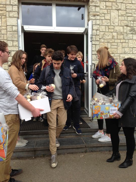 Het is al enkele jaren een fijne traditie. Aan het einde van de examenreeks, trakteert onze leerlingenraad alle leerlingen op heerlijke paaseitjes. Daarvoor werden ook dit jaar twee heuse Paashazen (Lotte en Victor!) opgetrommeld, geassisteerd door een hele bende laatstejaars.