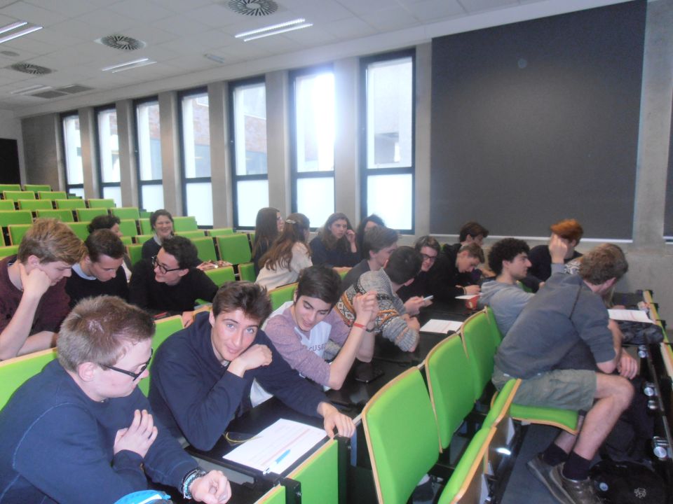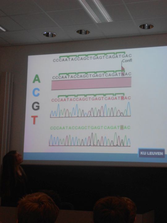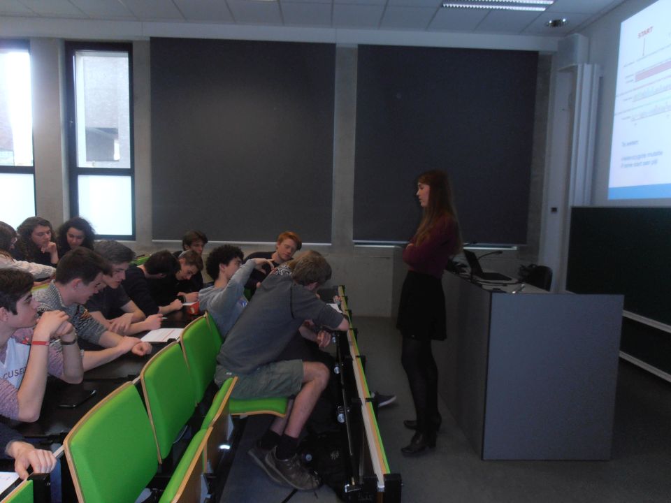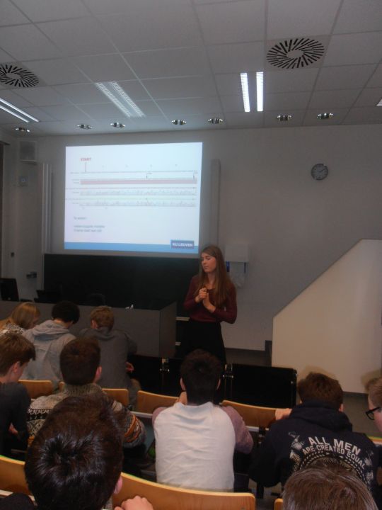 Na een korte middagpauze gingen we richting Gasthuisberg waar Delphine Verbeke, een oud-leerlinge van onze school met veel enthousiasme en flair haar doctoraatsonderzoek voorstelde. Delphine gaat samen met een gans team op zoek naar nieuwe geneesmiddelen in de strijd tegen Acute Lymfatische Leukemie, een vorm van bloedkanker. Het project bestaat uit het zoeken naar resistentiemechanismen tegen bepaalde medicatie en het uitwerken van combinatietherapieën om zo de huidige behandeling van patiënten te verbeteren. Ook de rol van bio-informatica werd hierbij belicht. Er was genoeg om uit te leggen dus. Tot slot kregen we ook een rondleiding doorheen de labo’s en core- faciliteiten.