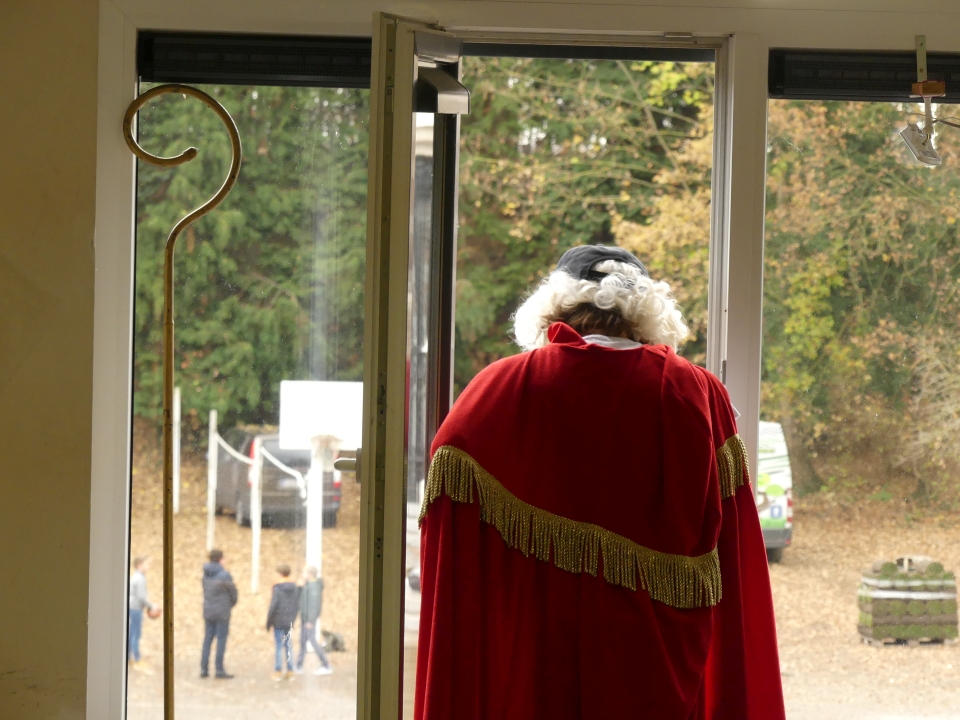 Even liep het bijna fout toen hun gammele wagen het net niet tot op de speelplaats haalde en het laatste eindje te voet moest worden afgelegd, met de bomma achterop. Ma, Pa en pubersint stonden al klaar voor de speech toen Bomma Sint, lichtjes geïrriteerd, kwam “aangesneld” met haar rollator. Ze bleken haar vergeten te zijn, .... toch niet goed die agenda’s nagekeken?