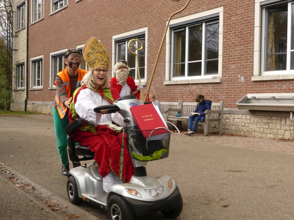 Even liep het bijna fout toen hun gammele wagen het net niet tot op de speelplaats haalde en het laatste eindje te voet moest worden afgelegd, met de bomma achterop. Ma, Pa en pubersint stonden al klaar voor de speech toen Bomma Sint, lichtjes geïrriteerd, kwam “aangesneld” met haar rollator. Ze bleken haar vergeten te zijn, .... toch niet goed die agenda’s nagekeken?